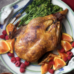 This crispy slow roasted duck is served with a raspberry orange port sauce. It's a simple, yet impressive, dinner recipe perfect for holidays and celebrations. Great for Christmas, Easter, Thanksgiving, and more! Easily impress your family or dinner guests!
